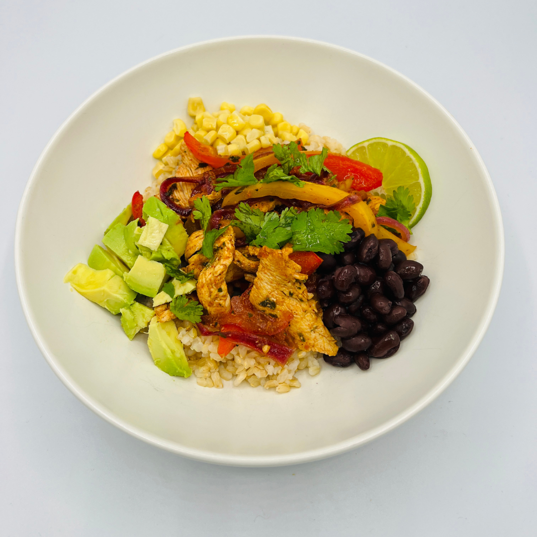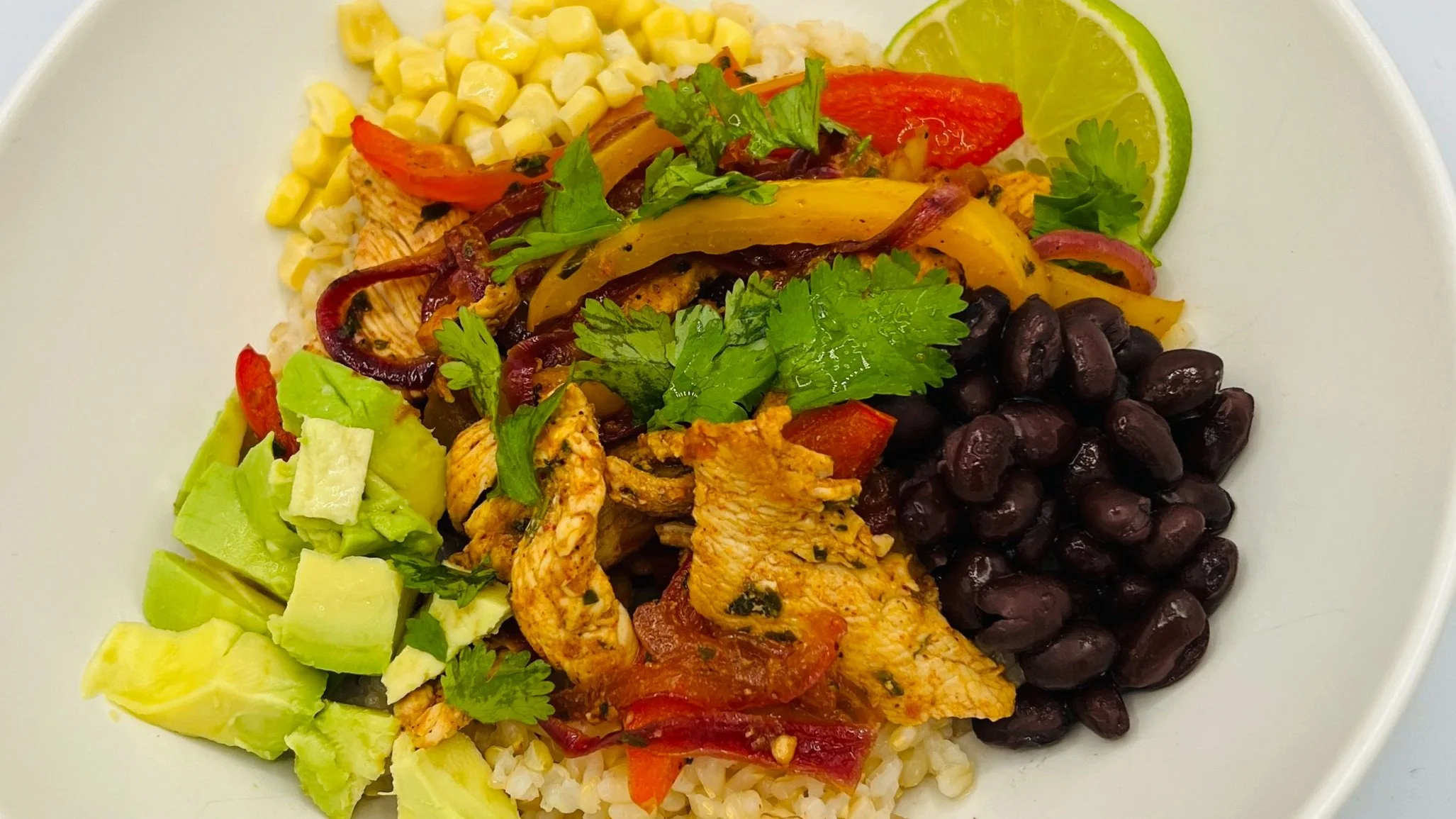 A meal packed with everything you love about traditional chicken fajitas with peppers and onions. This version is served in a bowl with corn and avocado.